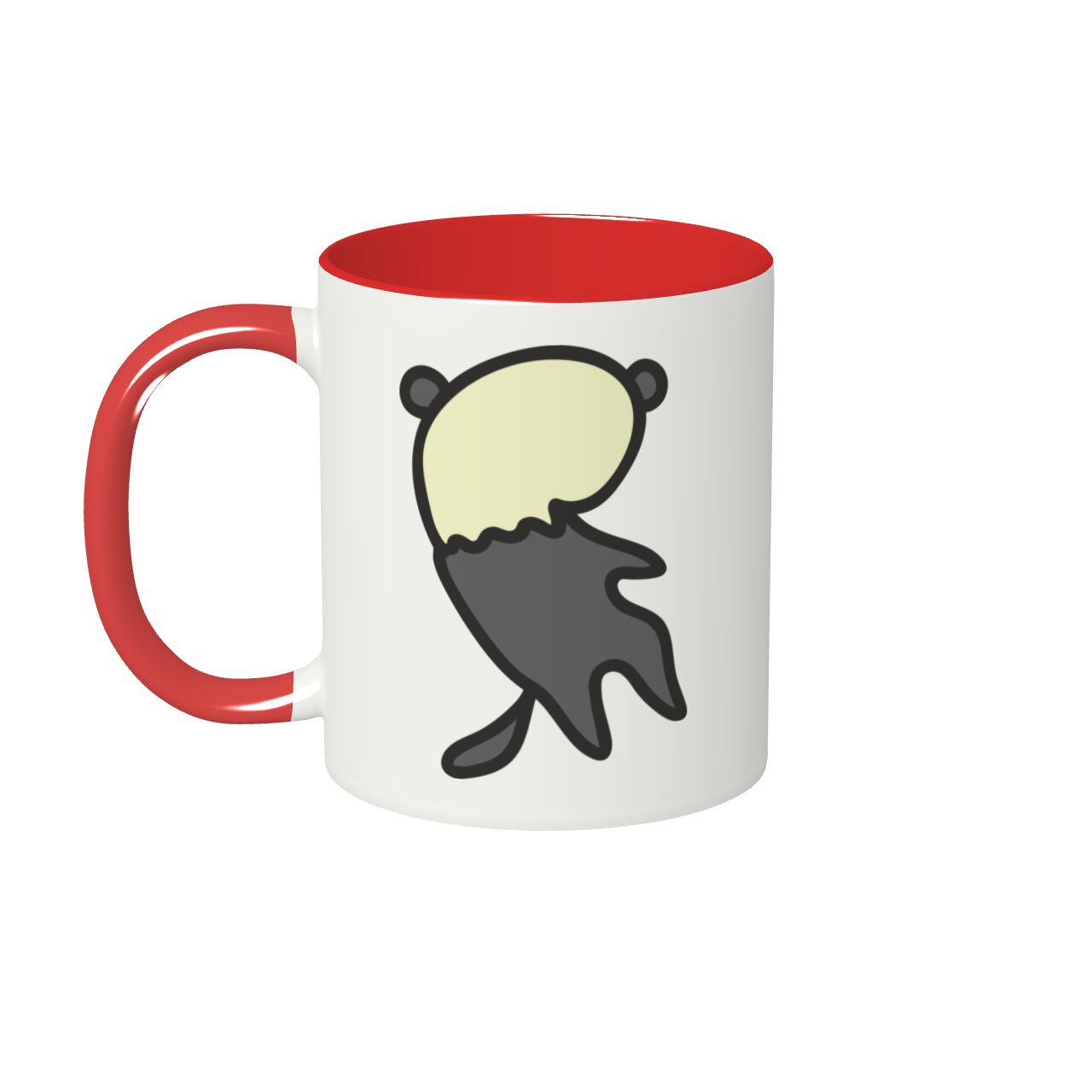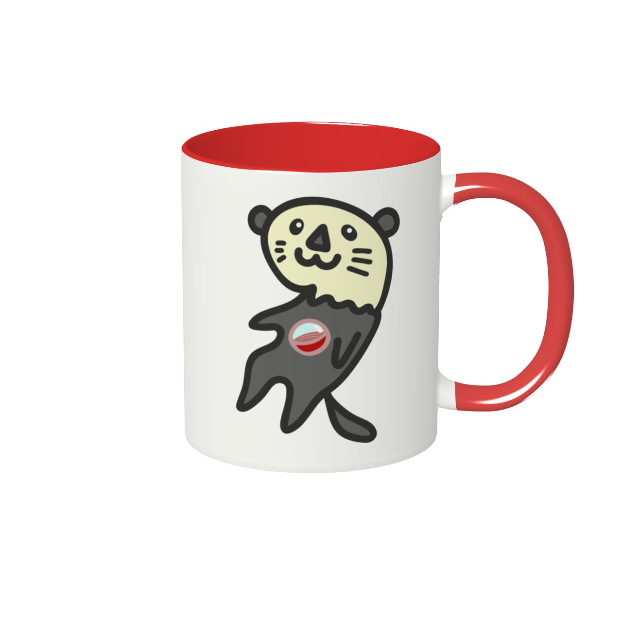 取っ手とカップ内側にレッドの差し色(底まで)が入った約350mlのマグカップだよ。
